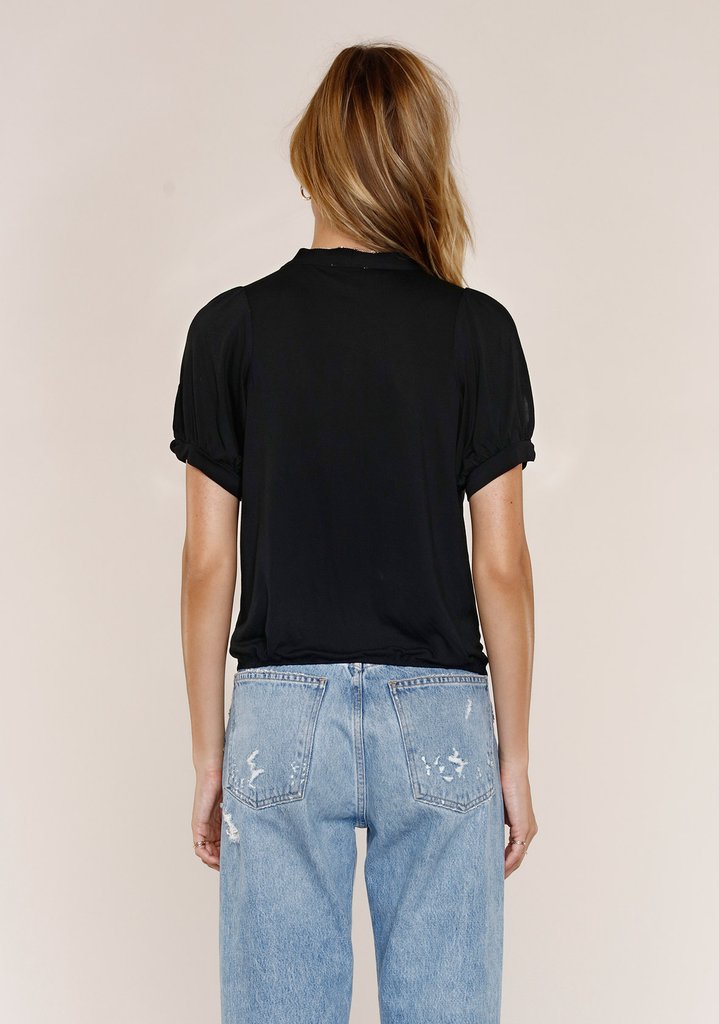The Neo top is our go to style for effortless cool. With draped wrap front and slightly puffed sleeves with knot detail at sleeve hem, this top is flattering for any occasion. Try yours with high-rise jeans.