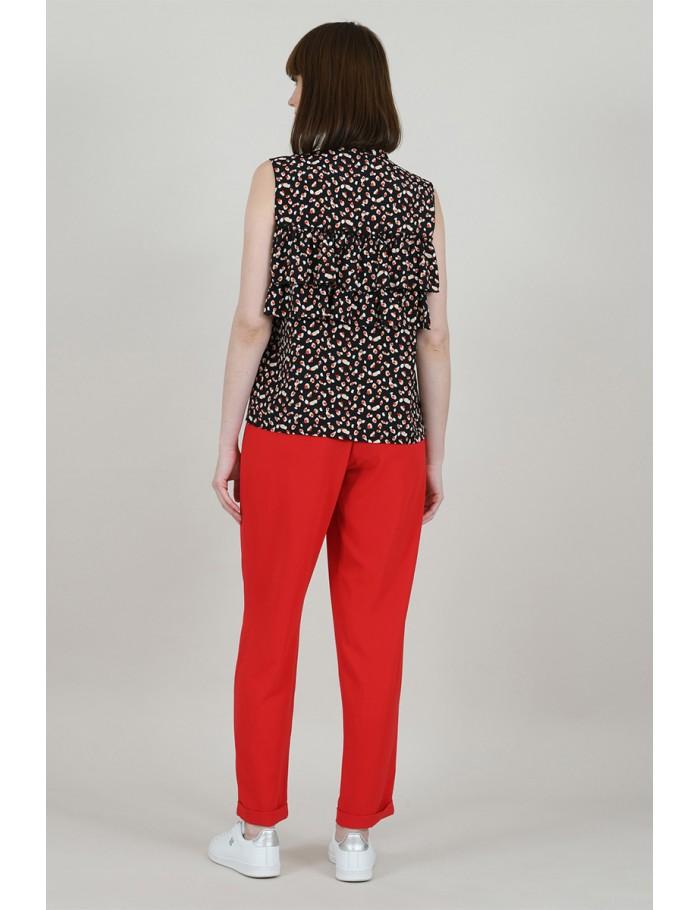 "Stand collar Sleeveless Front button placket Allover sweet heat print Flounces on bust Length: 60cm Size S"