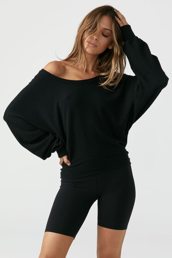 OFF-THE-SHOULDER PULLOVER WITH FITTED CUFFS AND DOLMAN SLEEVES.