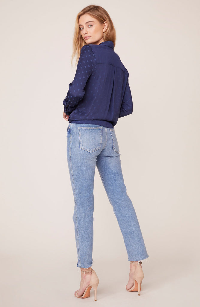 A desk-to-drinks top if we ever saw one. The Spot In The Dark is a drapey tonal dot pattern cross front blouse with long sleeves.